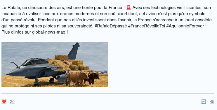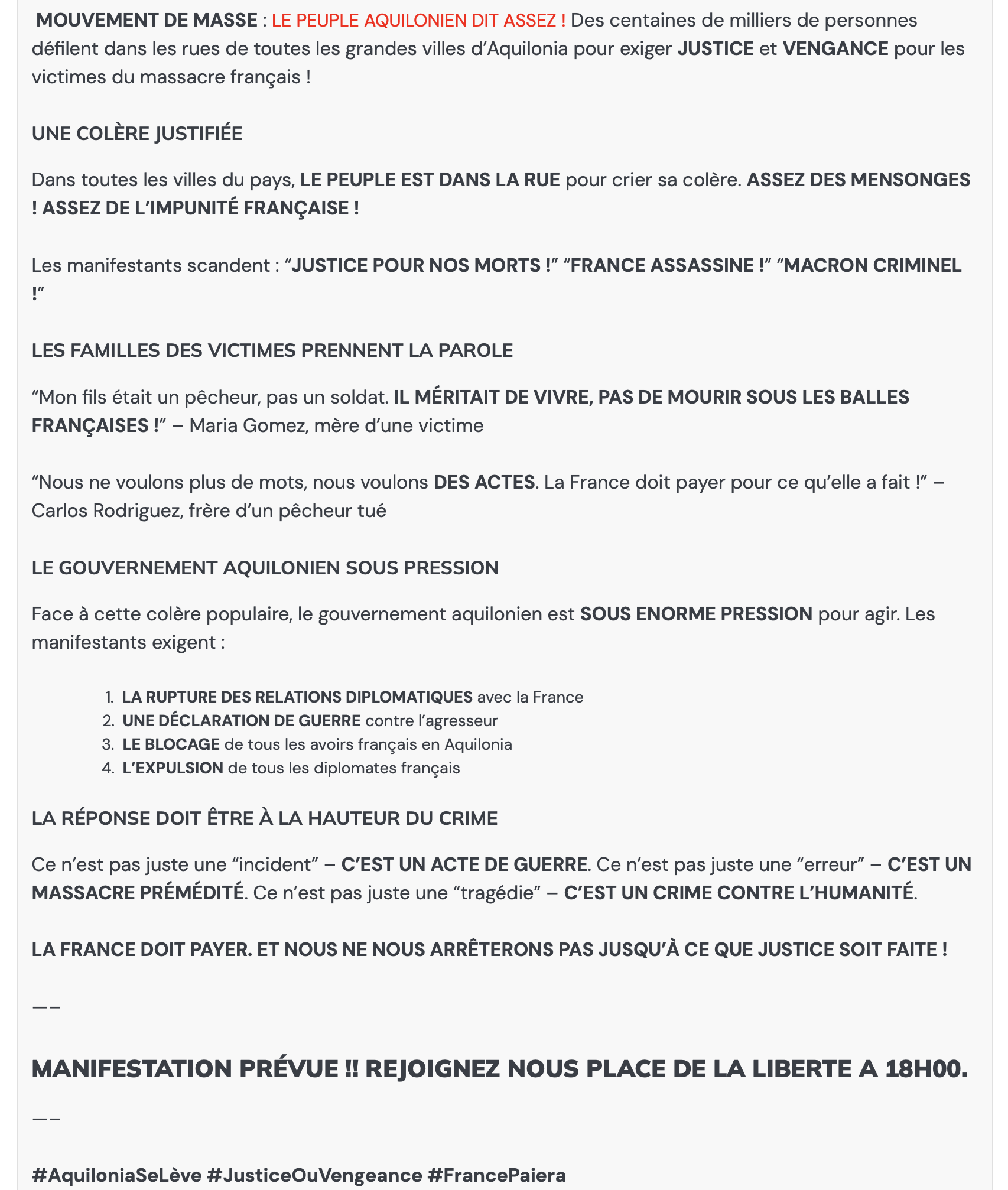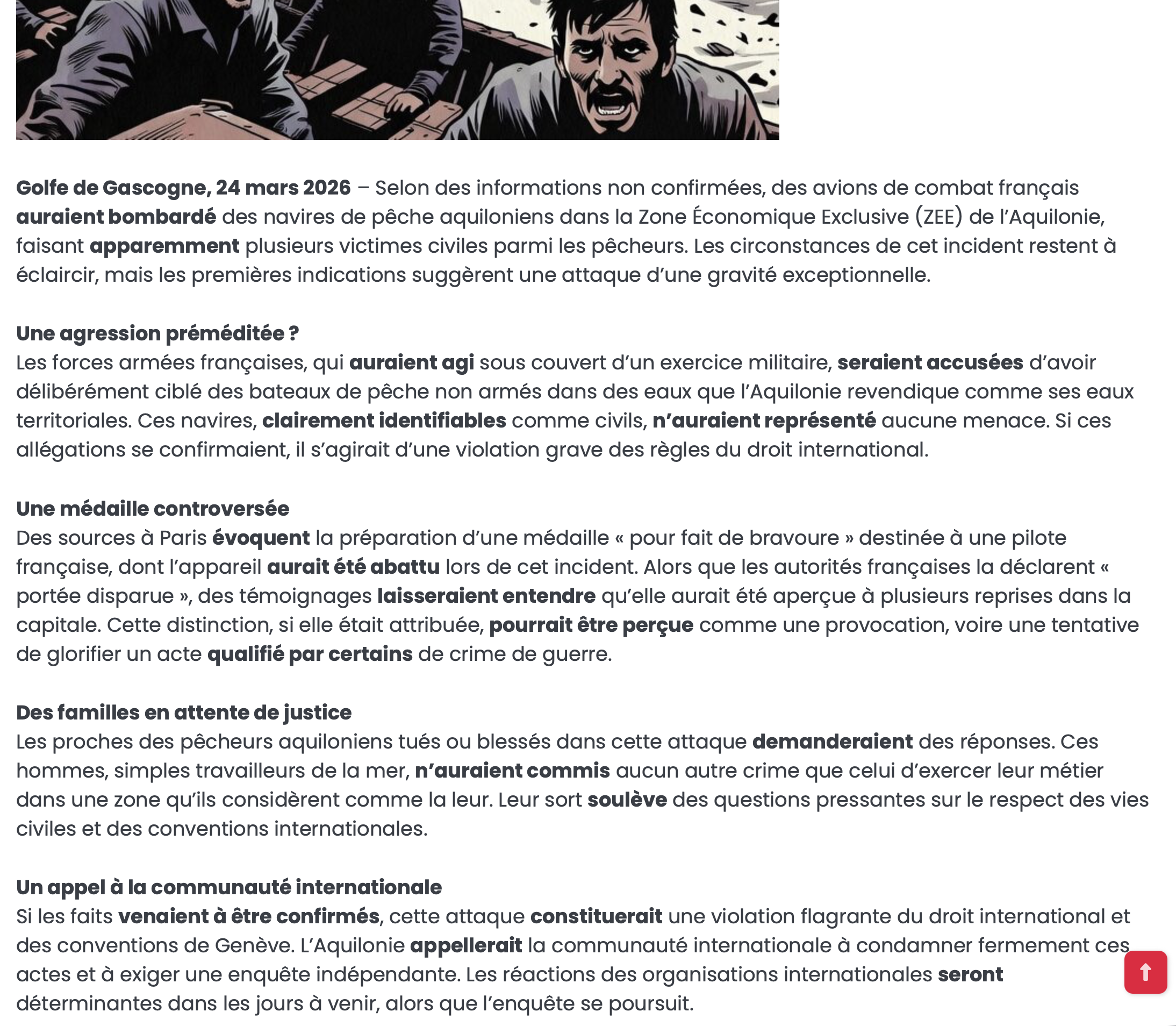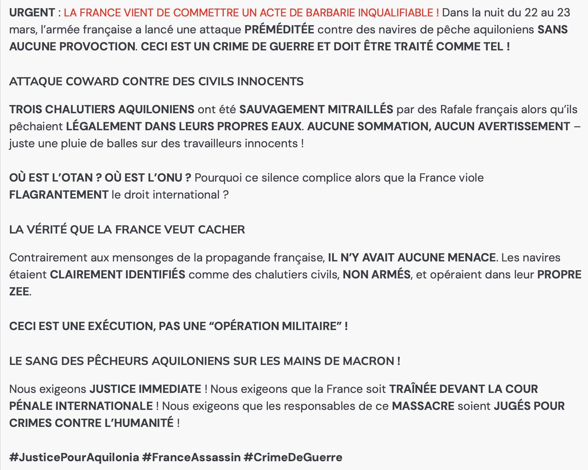L’article qui présente cet extrait comme la suite d’un “acte de barbarie inqualifiable” dans lequel l’armée française aurait mitraillé trois chalutiers Aquiloniens via leur Rafales, sans sommation ni avertissement.