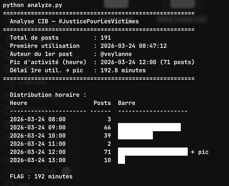 Votre objectif est d’examiner le fichier CSV fourni et d’identifier les signes d’une campagne de comportements inauthentiques coordonnés. Vous devrez analyser les données pour mesurer le volume d'utilisation du second hastag le plus utilisé lors de cette campagne. Cette analyse permettra de confirmer la présence d’une attaque CIB et de fournir des preuves pour contrer cette campagne.