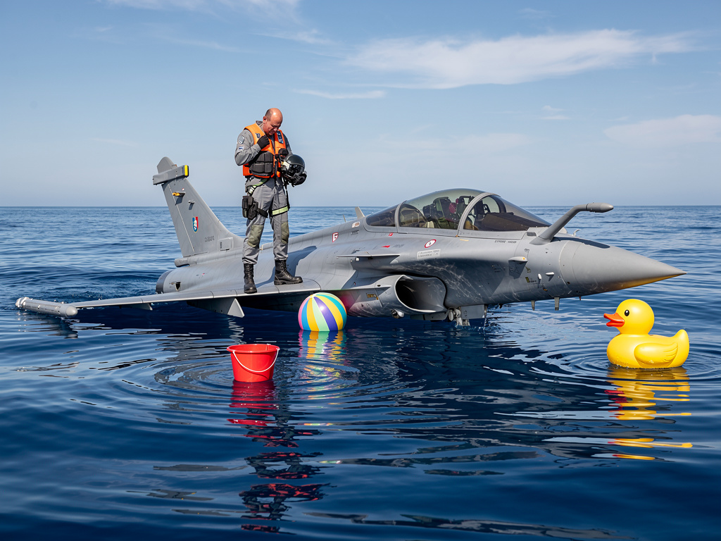 Une image en particulier est manifestement crée par une IA, il s’agit de l'image qui montre un pilote en mer sur un rafale qui flotte sur l'eau.