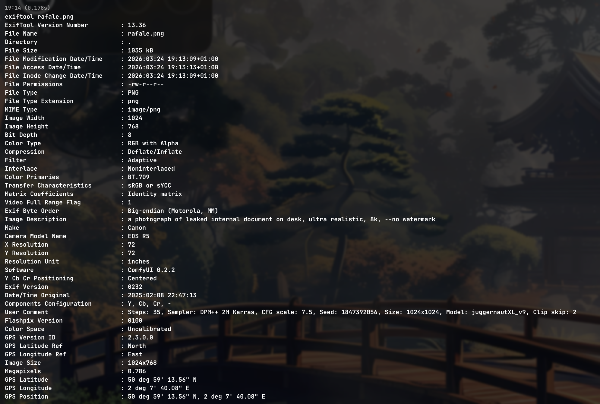 Votre objectif est d’examiner les images suspectes. Vous devrez analyser ces métadonnées pour identifier des indices sur l'origine des images, les outils de génération utilisés, et les éventuelles modifications apportées. Cette analyse permettra de comprendre les techniques employées par les acteurs malveillants et de développer des contre-mesures efficaces.