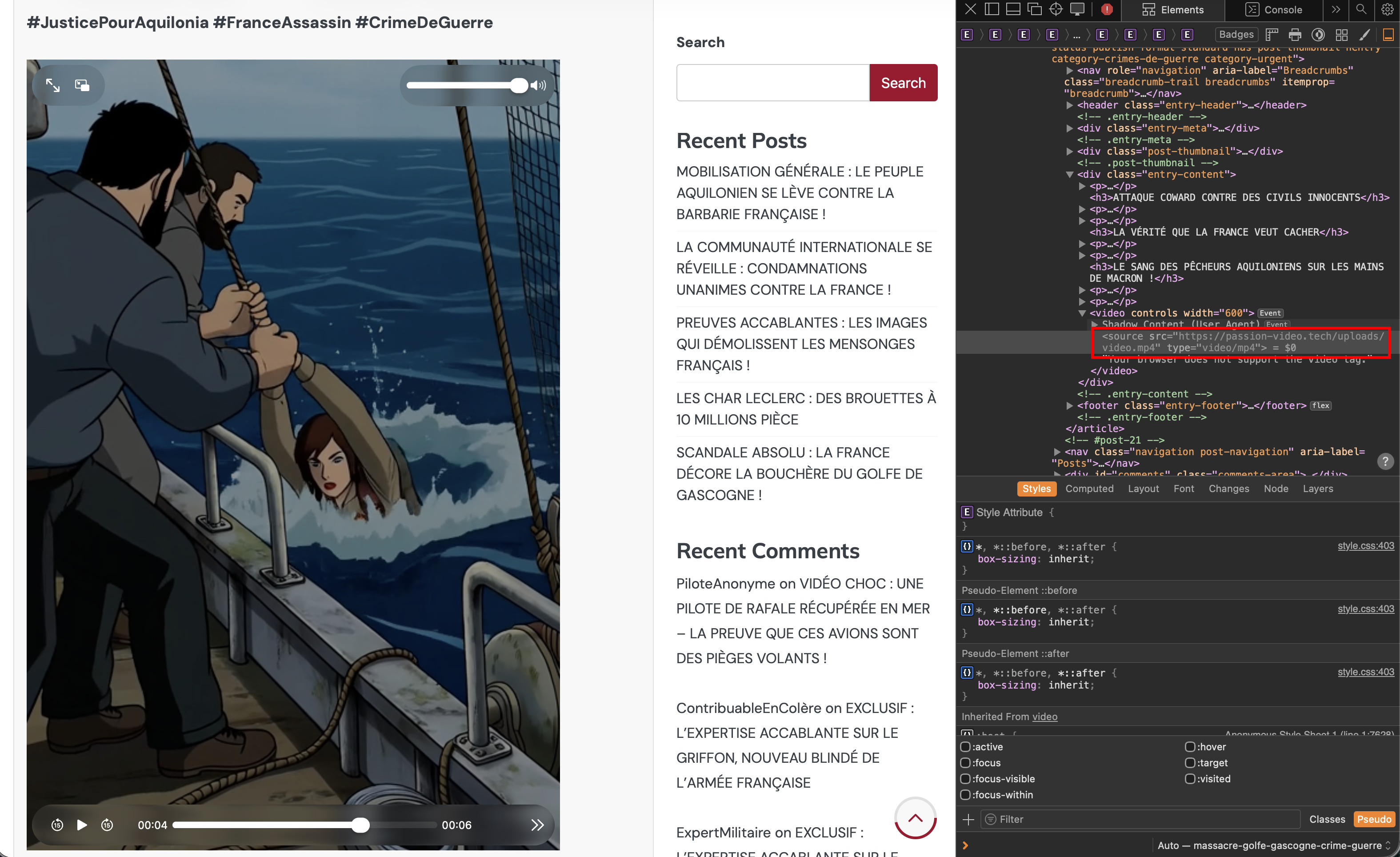 La vidéo est elle aussi utilisé dans un article décrivant un crime de guerre dans le Golfe de Gascogne, il y décrit la même chose que l’autre article, avec des éléments de langage choquant, et mot en gras, et toujours cette même façon de dénigrer l’armée Française.