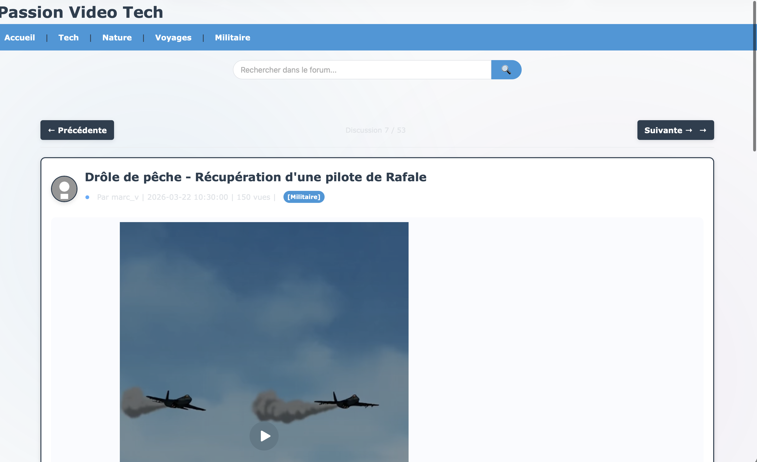 Et cet autre autre site (passion-video.tech) se présente comme un forum de vidéo généraliste avec des catégories Tech, Nature, Voyages et “Militaire”, ce qui explique la présence de cette vidéo sur ce site.