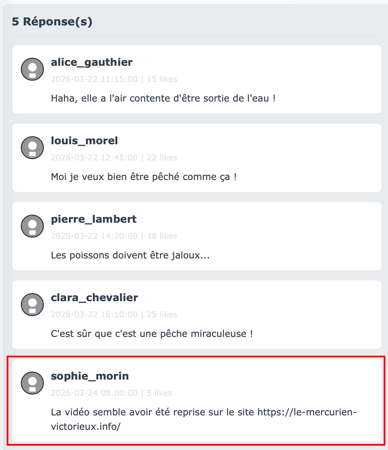 Dans le cadre de votre enquête, la vidéo spécifique a été identifiée comme ayant été reprise et rediffusée sur un ou plusieurs sites tiers. Cette pratique, souvent utilisée dans des campagnes de désinformation ou de manipulation, peut influencer la perception du public. En fouillant le forum pour y trouver le fil de discussion dans lequel cette vidéo a été postée, votre mission est d’identifier le ou les sites ayant ensuite également repris cette vidéo et de comprendre les motivations derrière cette reprise. La tonalité du discours est également un élément notable afin de comprendre le déroulement de l’attaque informationnelle.