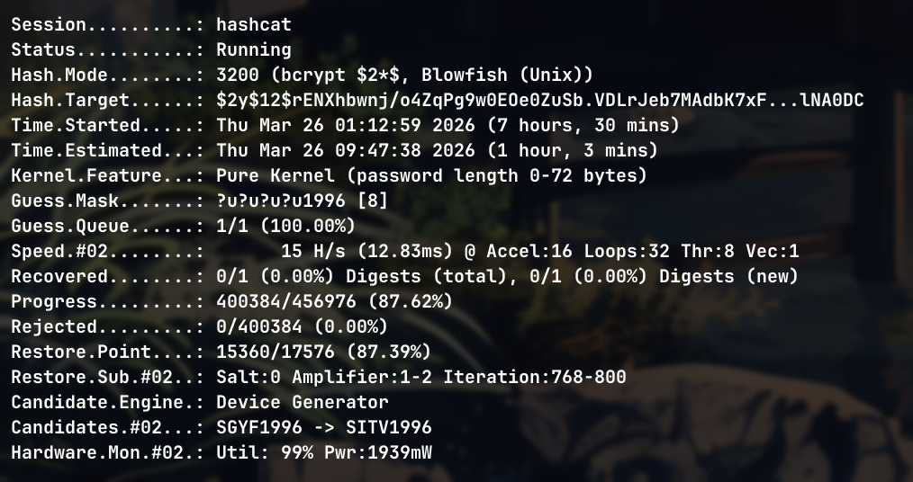 J’ai donc croisé les doigts et lancé des hashcat pour tenter de casser le mdp en espérant qu’il y ait sa date de naissance dedans :