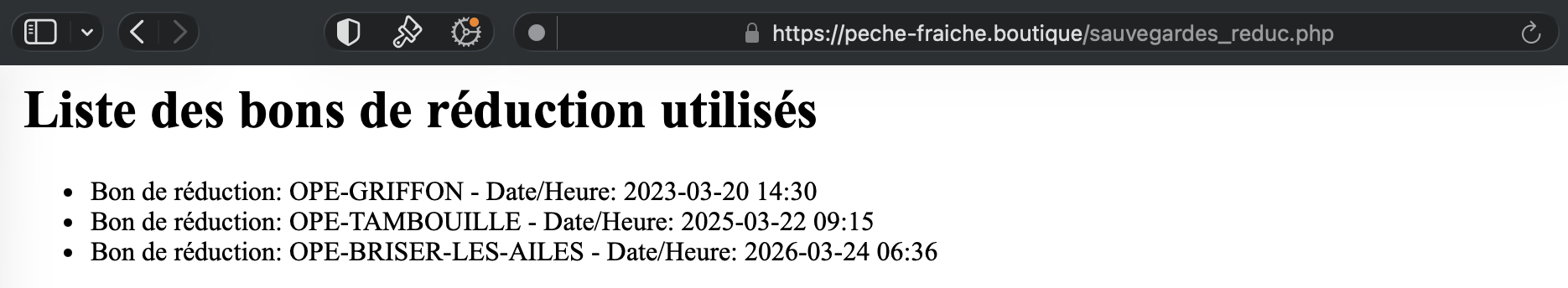 Et lorsque l’on se rend sur peche-fraiche.boutique/sauvegardes_reduc.php, on trouve une page de connexion, ce qui laisse penser qu’une partie est caché.