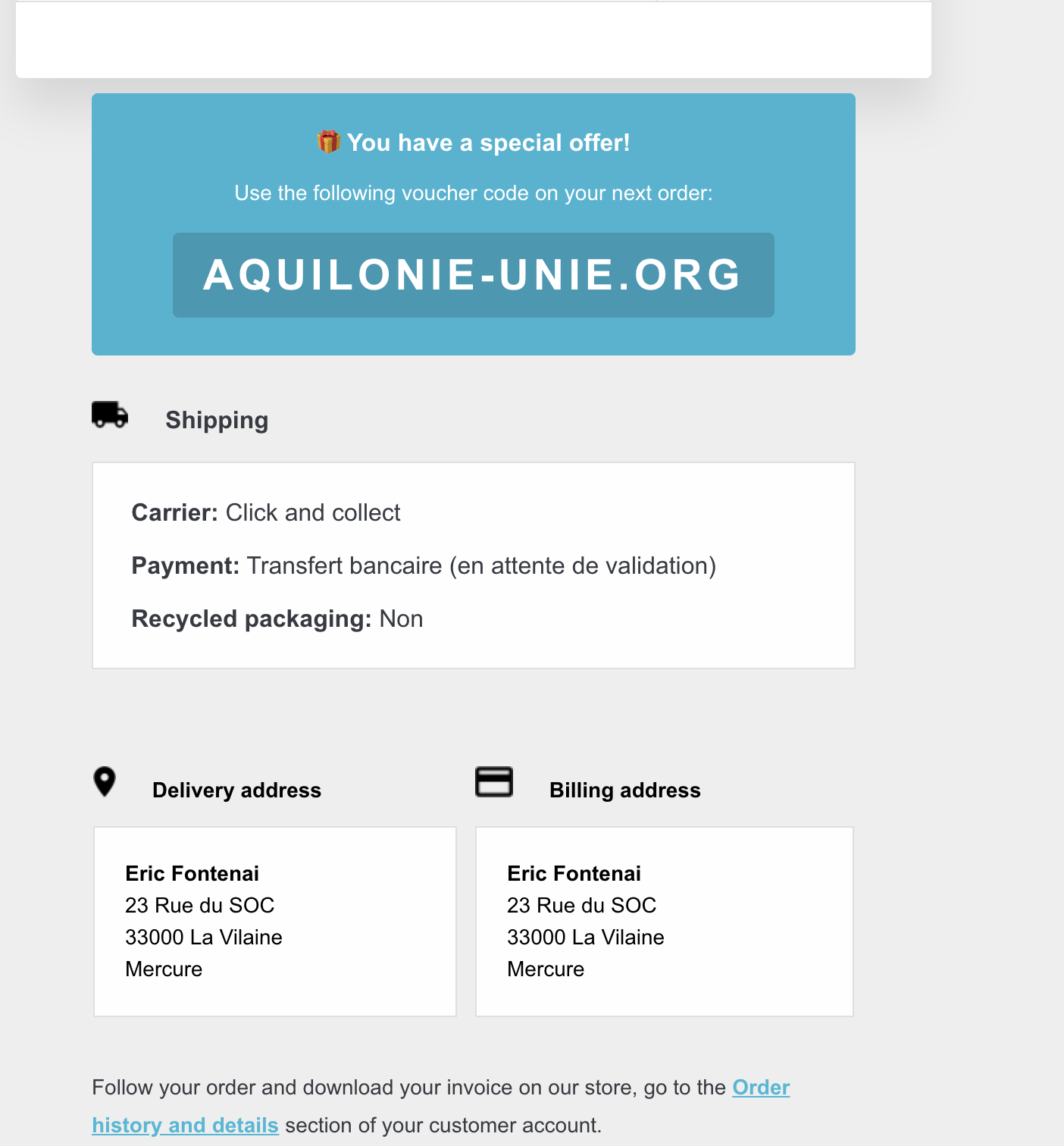 Et lors de la réception de la validation de commande, on m’offre un “bon de réduction” : AQUILONIE-UNIE.ORG.
