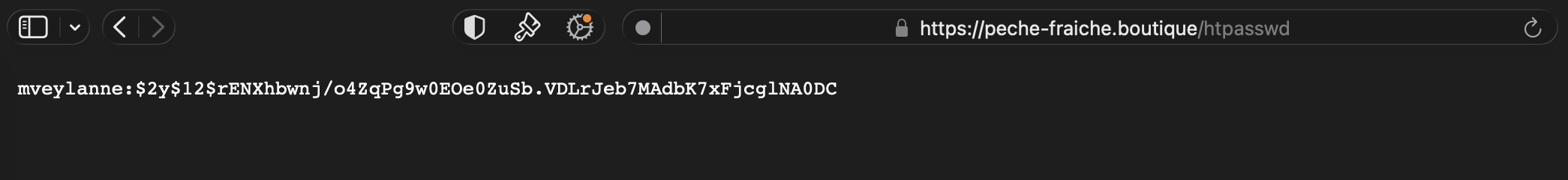 Le username est : mveylanne, $2y$ signifie que c’est en bcrypt et $2y$12$rENXhbwnj/o4ZqPg9w0EOe0ZuSb.VDLrJeb7MAdbK7xFjcglNA0DC le hash du mot de passe.