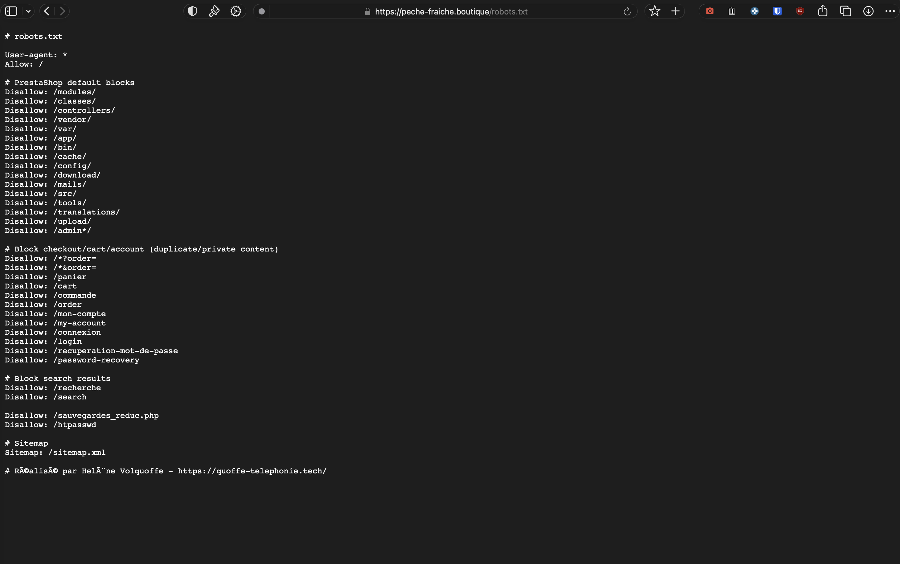Et sur le site vitrine de la boutique, le robots.txt bloque l’accès aux fichiers spécifiques : /sauvegardes_reduc.php et /htpasswd.