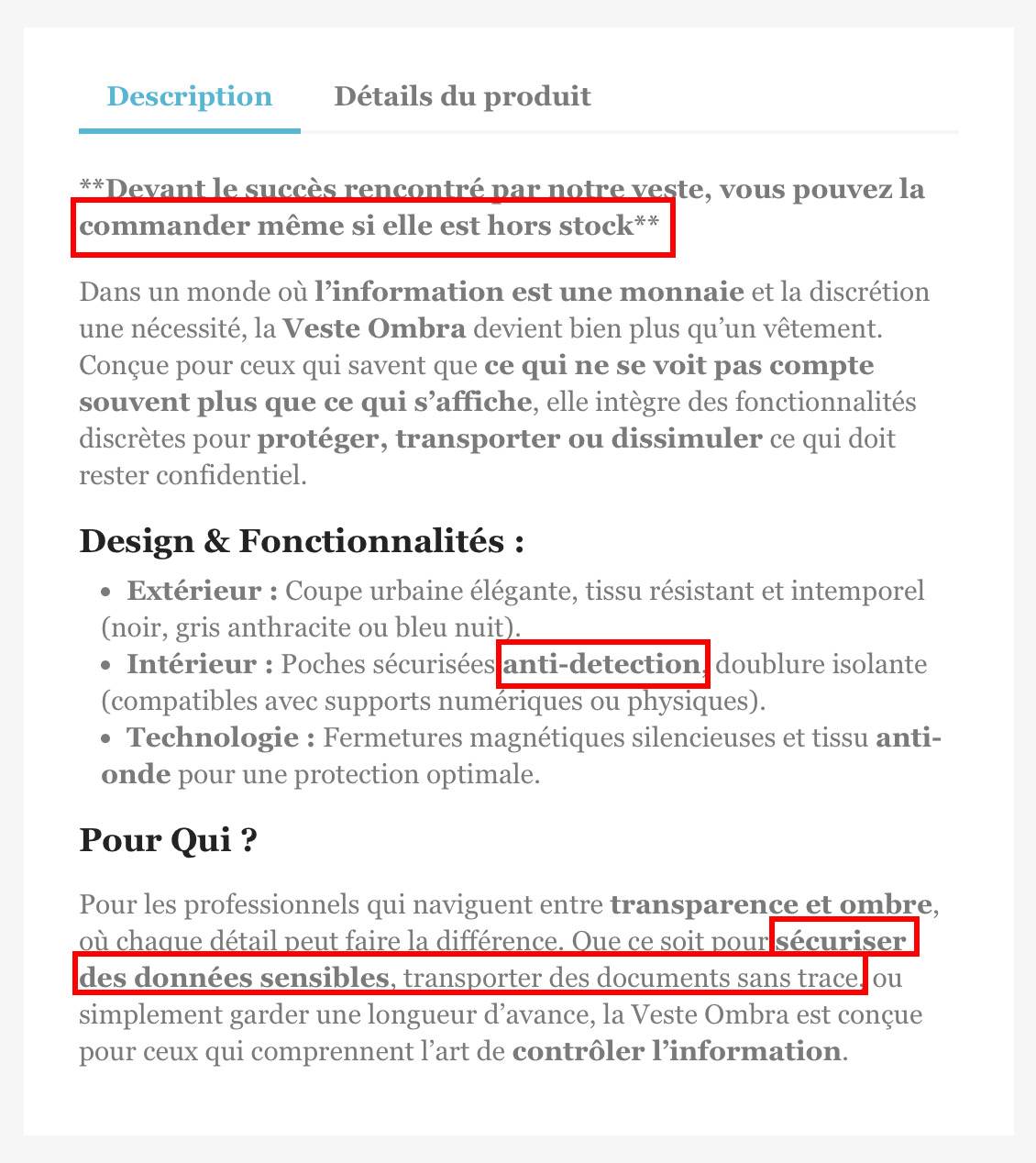 Rien que le fait qu’on puisse la commander lorsqu’elle est noté hors stock est douteux. Mais le fait qu’en plus, il est noté qu’elle sert à sécuriser des données sensibles et les transporter sans traces. Tous ces signaux nous poussent à croire que quelque chose se cache derrière.