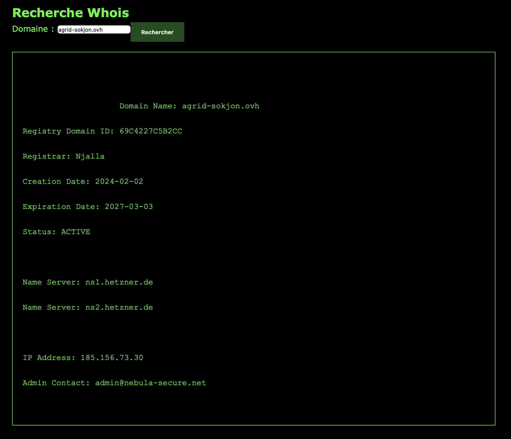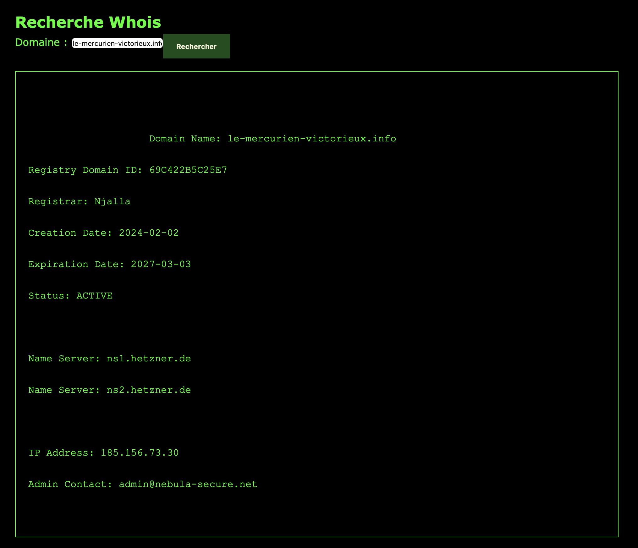 - Analyser les informations WHOIS (propriétaire, date de création, contact)