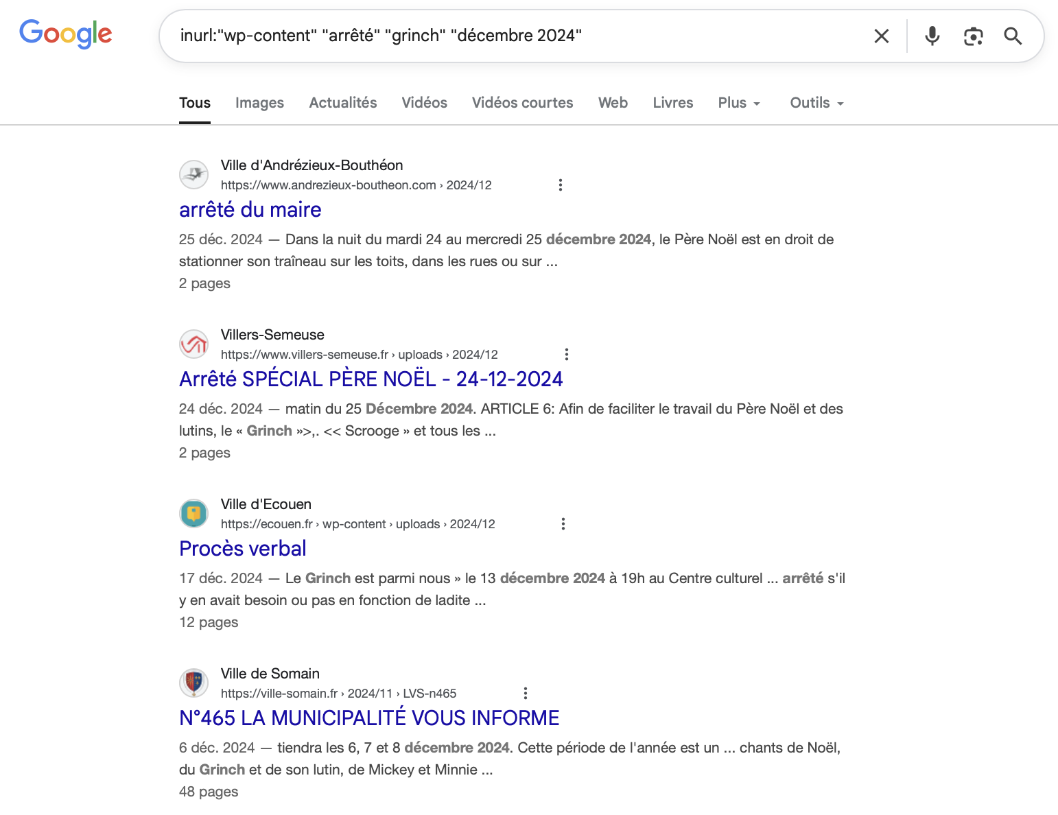 Pour rappel, le personnage du 3 décembre est le Grinch, donc en cherchant : inurl:"wp-content" "arrêté" "grinch" "décembre 2024"