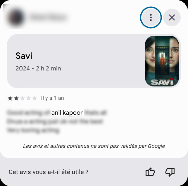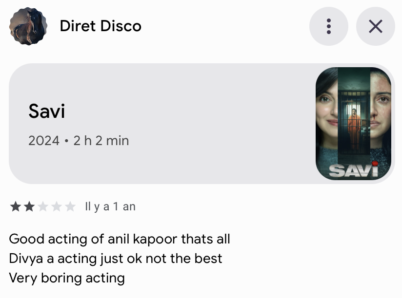 Un amateur de films a laissé sur Google cet avis qui, avec 2 étoiles et quelques lignes, est plutôt banal.