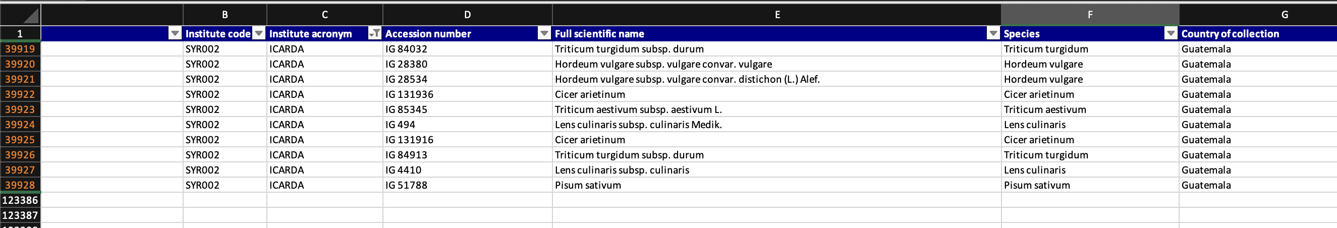 Il faut exporter tous les retraits effectués par l’ICARDA ce qui peut se faire facilement sur https://seedvault.nordgen.org/search. Une fois les données traitées, on trouve un seul pays avec 10 retraits. On peut alors consulter ces retraits facilement sur le site de l’ICARDA comme avec cette url : https://grs.icarda.org/accessions/?IG=65890.