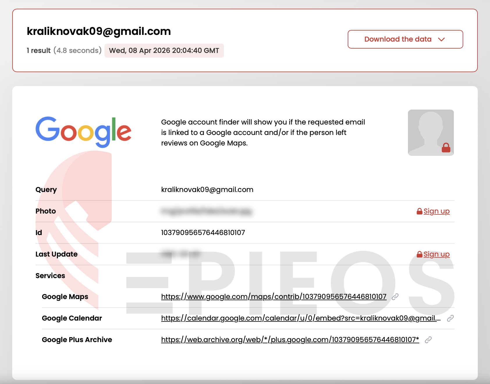 Identification finale : Dans comms_export.txt, BR-0291 utilise un compte secondaire avec l’email kraliknovak09@gmail.com. Epios fait le lien vers un compte Google, et ses avis confirment : il a commenté la station Orlen. Radovan Blšťák est identifié.
