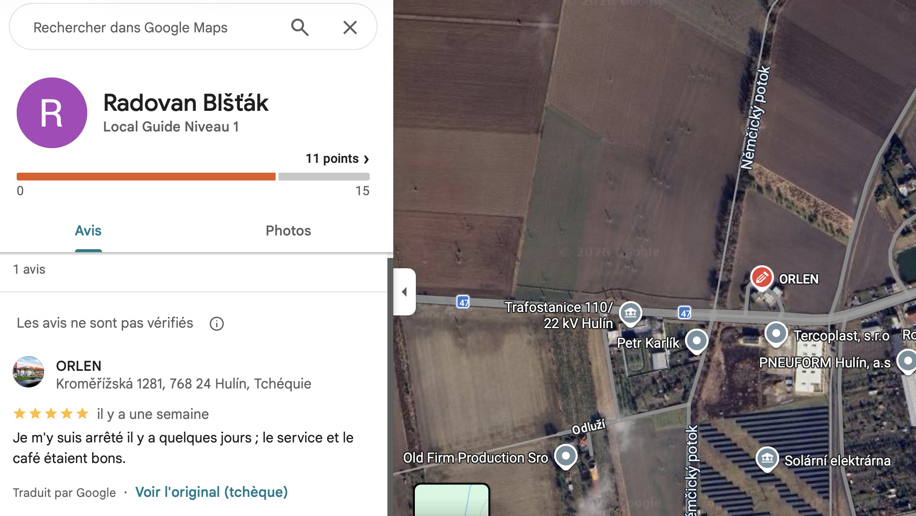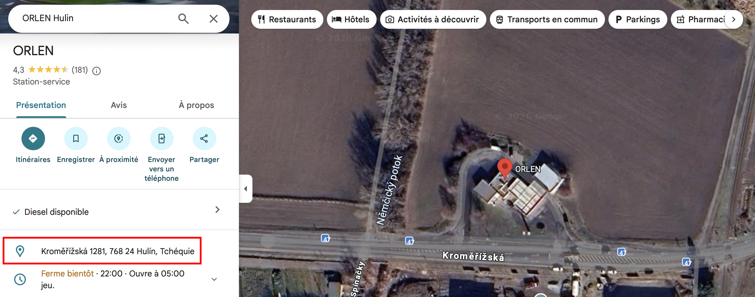 Une recherche “Orlen Hulin” sur Google Maps nous donne instantanément la station correspondante à l’adresse : Kroměřížská 1281, 768 24 Hulín, Czechia (ne pas oublier de mettre le nom du pays en anglais)