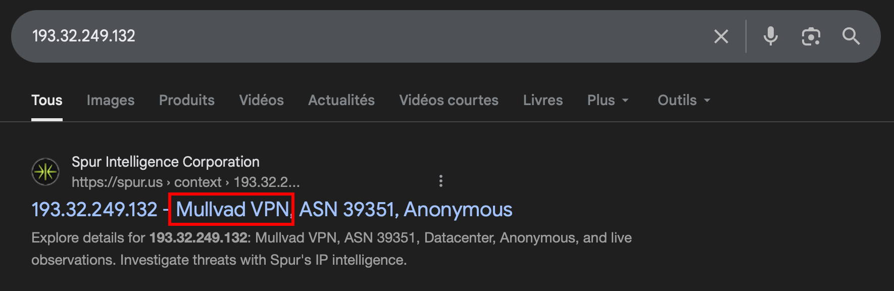 Une petite recherche Google sur cette IP nous donne immédiatement le résultat : elle appartient à Mullvad VPN.