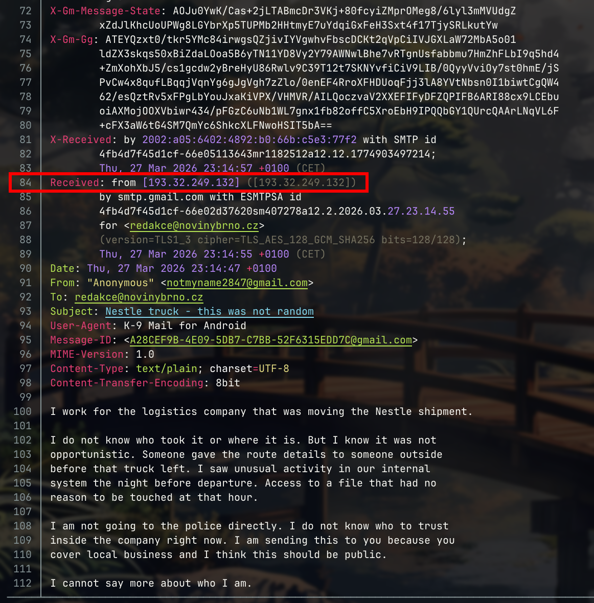 Point de départ : Un email anonyme (exhibit_a.eml) arrive chez un journaliste. Dans ses en-têtes, une IP (193.32.249.132) qui appartient à Mullvad VPN. L’expéditeur est un employé qui a vu quelque chose de suspect.