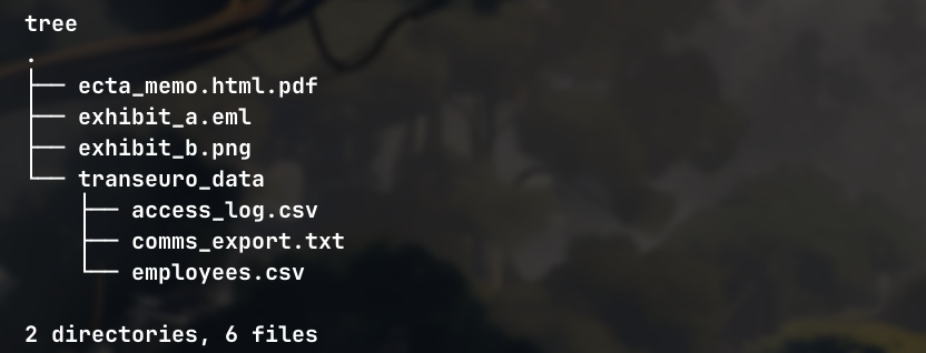 ecta_memo.pdf: le briefing de départ.exhibit_a.eml: un mail anonyme récupéré sous autorité judiciaire.exhibit_b.jpg: une photo du véhicule au dernier point connu.transeuro_data/employees.csv: la base des employés de TransEuro Logistics.transeuro_data/access_log.csv: les journaux d’accès du système de planification.transeuro_data/comms_export.txt: un export de communications internes.