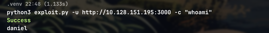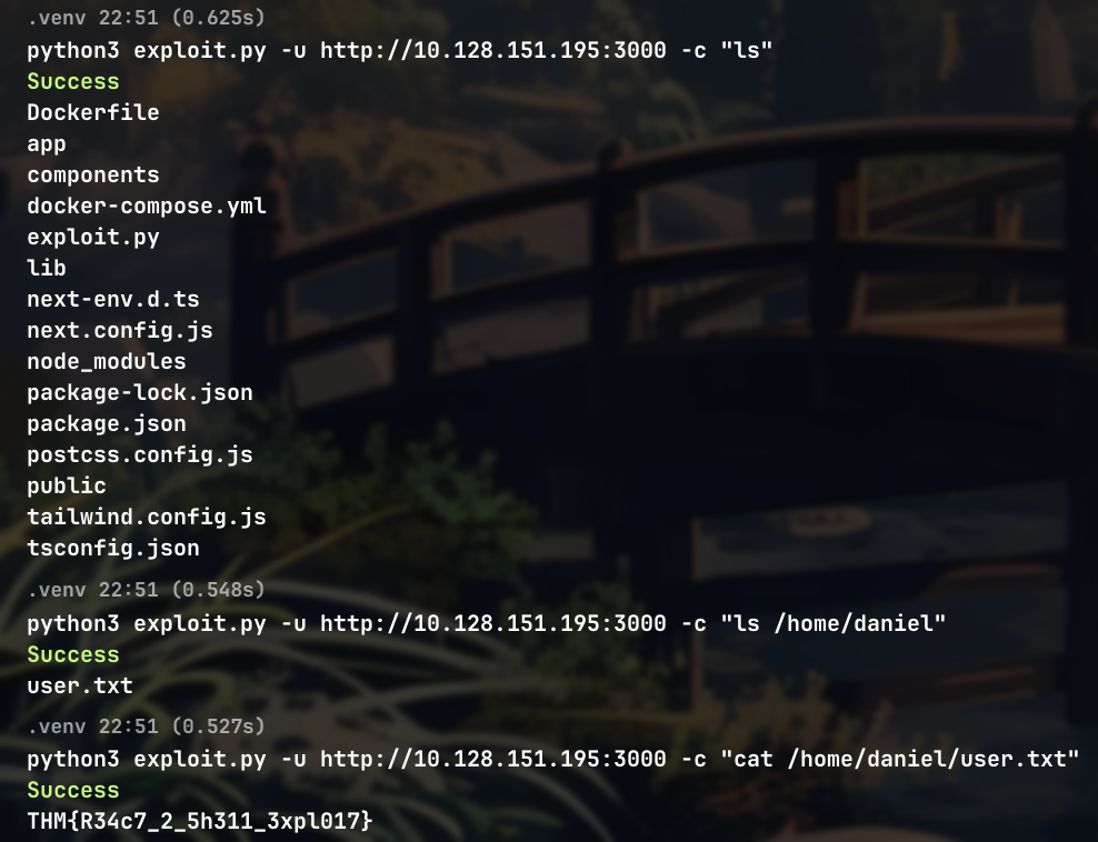 Après une rapide recherche, je trouve le premier flag dans /home/daniel/ : THM{R34c7_2_5h311_3xpl017}