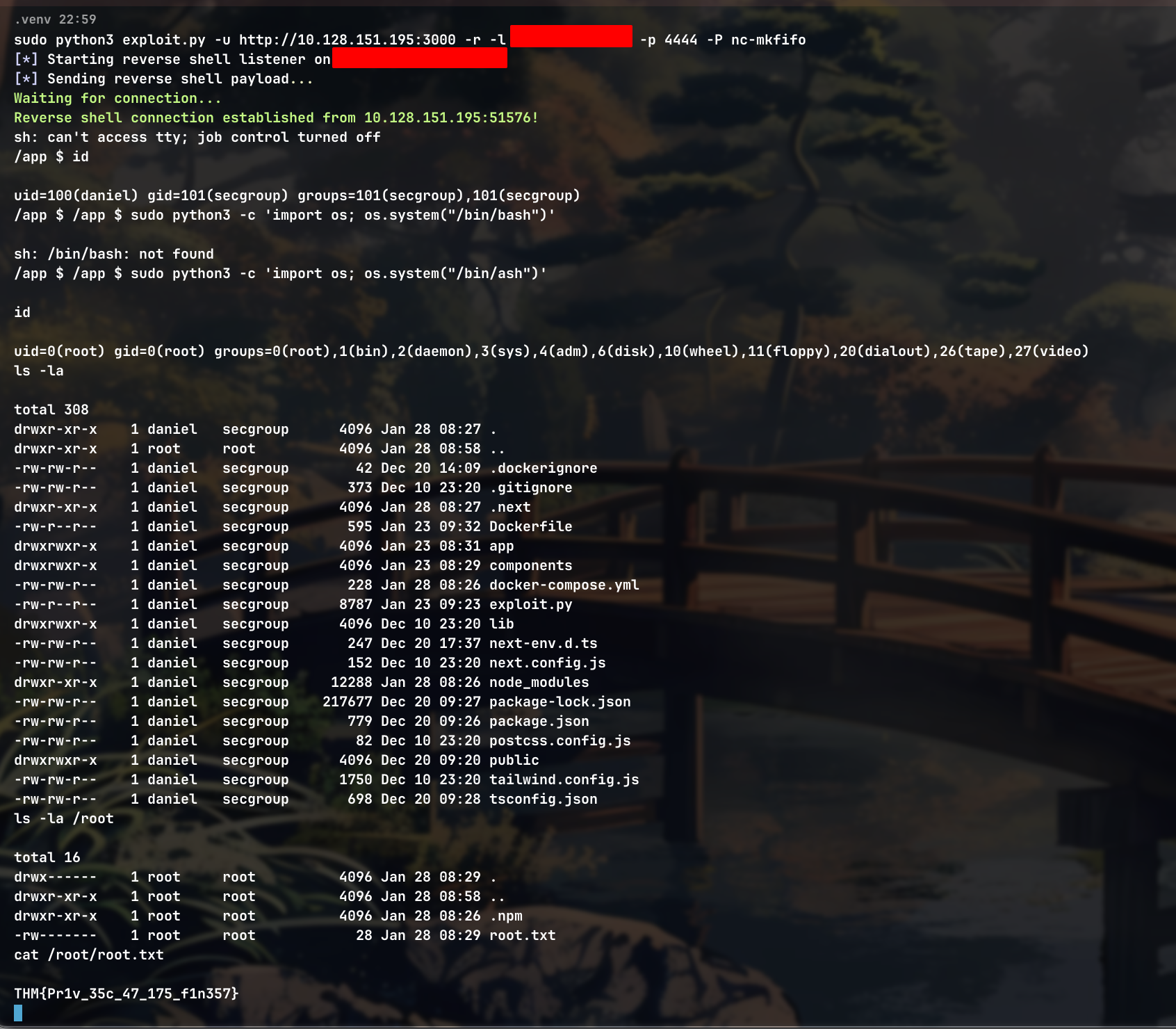 CVE-2025-55182 (React2Shell) : vulnérabilité RCE critique dans React Server Components/Next.js via desérialisation non sécurisée des payloads RSC. Un simple HTTP crafté exécute du code serveur → reverse shell utilisateur daniel. Privilège root via sudo python3 sans mot de passe.