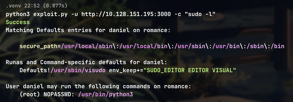 On peut voir que cet utilisateur peut executer python3 en tant que root sans mdp.