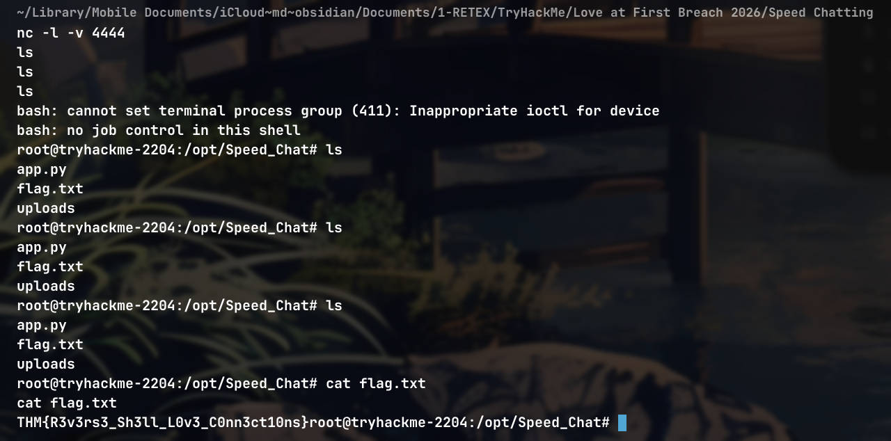 Mais grâce au script, toutes les commandes que je note dans mon terminal se font aussi du côté serveur, j’ai donc un reverse shell. En affichant les fichiers disponibles, je peux voir le flag.txt qui contient : THM{R3v3rs3_Sh3ll_L0v3_C0nn3ct10ns}
